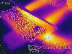 Las temperaturas de la superficie ya son bastante cálidas cuando se está en ralentí en el escritorio a casi 37 C por encima de la primera fila de teclas del teclado. Nuestras mediciones de consumo de energía a continuación respaldan estas lecturas, ya que son inusualmente altas para una computadora portátil en reposo. Afortunadamente, los puntos calientes están alejados de las teclas del teclado y de los apoyos de la palma de la mano, por lo que el portátil nunca resulta incómodo de usar cuando se juega.