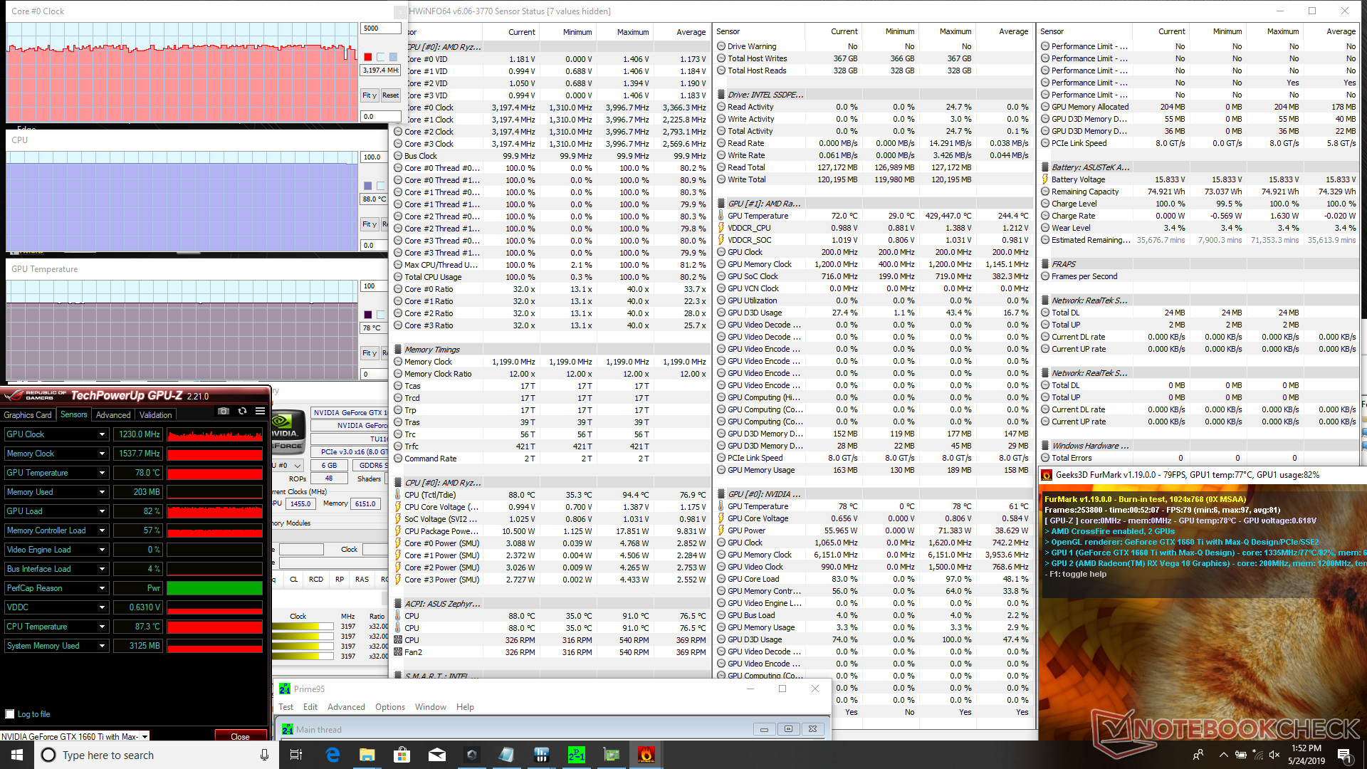 | Prime95 + FurMark Stress | ~3.6 | 1230 | 88 | 78 |