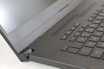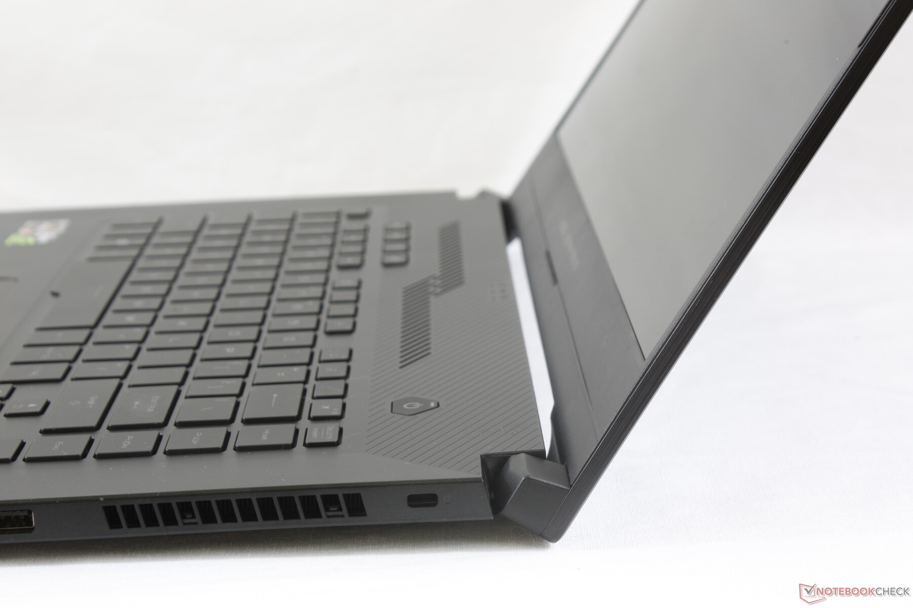 La rigidez de la base es muy buena con un mínimo chirrido y deformación cuando se intenta doblar los bordes o presionar el centro del teclado. Encontramos que es un poco más débil que el Alienware m15, pero definitivamente más fuerte y menos desvencijado que el MSI GS65. La tapa flexible sigue siendo el eslabón más débil, al igual que en los otros portátiles Zephyrus, y sus bisagras superpequeñas y el ángulo estrecho de la tapa de 130 grados no han mejorado en absoluto. Portátiles con tapas más rígidas como el Razer Blade 15, XPS 15, e incluso el propio ROG Strix II GL504 de Asus demuestran que el Zephyrus puede hacerlo mejor en este sentido.