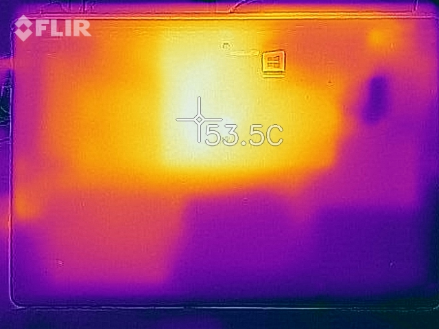 Las temperaturas exteriores alcanzan un máximo de 50 °C (122 °F) en la parte inferior, que sigue estando dentro del rango aceptable para un portátil relativamente delgado con gráficos dedicados. En la prueba de esfuerzo con Prime95 y FurMark, el procesador puede funcionar inicialmente a 2,7 GHz y 25 vatios durante un breve período de tiempo, pero después de unos 30 segundos, la velocidad del reloj se limita a 1,2 GHz y el consumo de energía de la CPU sólo es de 7 vatios. La GPU también se ve afectada por el estrangulamiento dependiente de la temperatura, y su velocidad de reloj es de sólo unos 1000 MHz en lugar de 1500.
