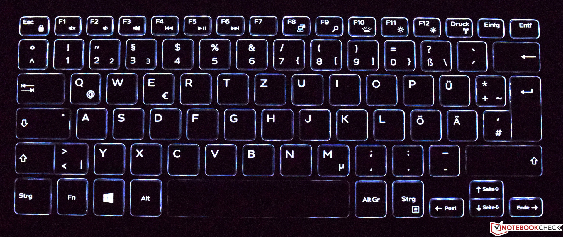 Los mecanógrafos ávidos se van a enamorar del teclado chiclet del Inspiron 15 5579. La superficie antideslizante de 16 x 15 mm de las teclas es muy agradable al tacto. Un punto de acentuación bien definido y muy consistente es seguido por un recorrido de la tecla bastante corto con el que no todos los usuarios se sentirán cómodos, pero al menos la pulsación de la tecla estaba bien definida y firme. Las etiquetas son fácilmente legibles y están soportadas por una retroiluminación blanca de dos niveles. Excepto por la barra espaciadora, el ruido era mínimo. Sin embargo, las pequeñas teclas de cursor definitivamente van a tomar algo de tiempo para acostumbrarse.