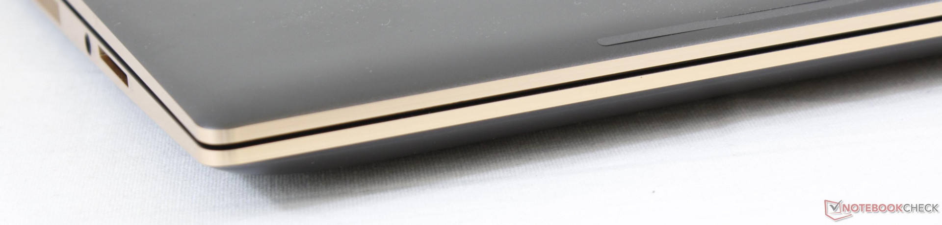 El 2018 Spectre x360 15 incluye los mismos puertos que el 2017 Spectre x360 15, aunque ligeramente reorganizado. El puerto de audio está ahora más cerca del borde frontal, los puertos HDMI y USB Type-C han sido intercambiados, y un lector de huellas dactilares dedicado se encuentra ahora entre las rejillas de ventilación y el basculante de volumen. Estamos encantados de volver a ver el puerto USB de tipo A, ya que no está presente en el XPS 15 9575 de la competencia.