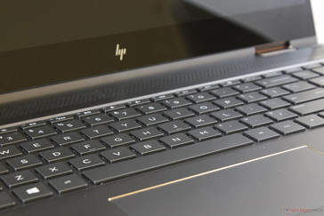 El teclado Chiclet es mucho más ancho esta vez (~34.1 x 10.0 cm) para acomodar el nuevo NumPad sin afectar la retroalimentación o el recorrido de las teclas QWERTY originales. A diferencia del NumPad de la mayoría de los demás portátiles, las teclas NumPad del Spectre no se reducen en tamaño ni se hacen más delgadas que las teclas QWERTY. Este es uno de los NumPads más cómodos y espaciosos que hemos utilizado en un portátil.