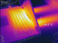 Bajo carga, las temperaturas son sorprendentemente frías en el Flex 6 14; medimos promedios de 27,2 °C y 30,3 °C en la parte superior e inferior, respectivamente, con sólo un punto caliente realmente problemático en el cuadrante superior central de la parte inferior (46 °C). Sin embargo, los valores de inactividad eran un poco más elevados de lo normal, por lo que aquellos que se resienten de un regazo caliente mientras calculan podrían querer prestar atención.