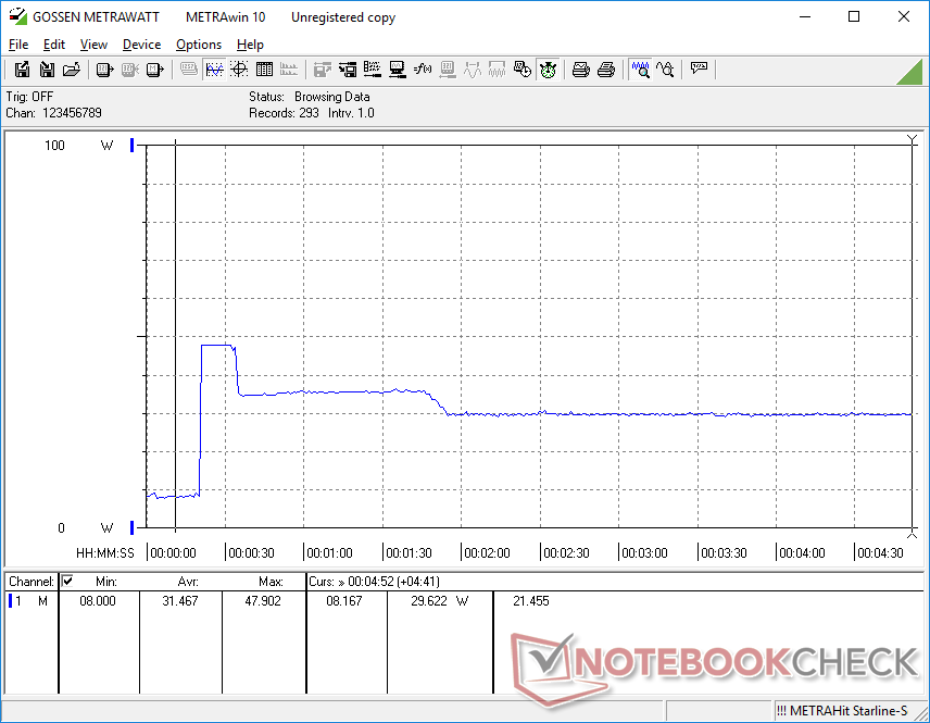 Podemos registrar un consumo de energía de 47,9 W del pequeño adaptador de CA de 45 W (~9,5 x 4,0 x 2,5 cm) cuando se ejecuta Prime95 para poner el procesador al límite de sus posibilidades. El consumo de energía disminuye y se estabiliza en 29,6 W después de sólo unos segundos debido al estrangulamiento del rendimiento. Este comportamiento coincide con nuestras observaciones durante la prueba de bucle CineBench R15 y la prueba de esfuerzo anteriores.