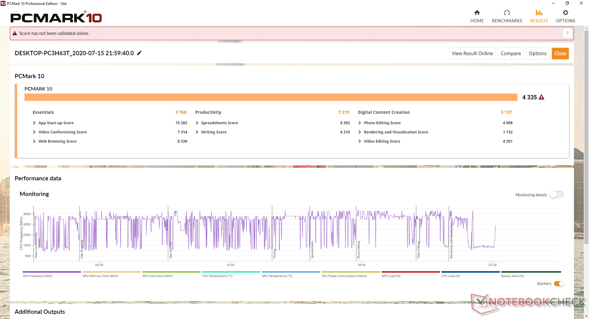 Los usuarios que tengan la intención de ejecutar cargas largas y exigentes deberían buscar en otra parte. El rendimiento de la CPU cae bruscamente después de unos pocos minutos de cargas de procesamiento extremas y la falta de opciones de Ryzen o de GPU adicionales se hará obvia después de ejecutar tareas de alta carga gráfica. El sistema funciona muy silenciosamente y con una larga duración de la batería como resultado, pero el rendimiento medio del procesador es el precio a pagar.