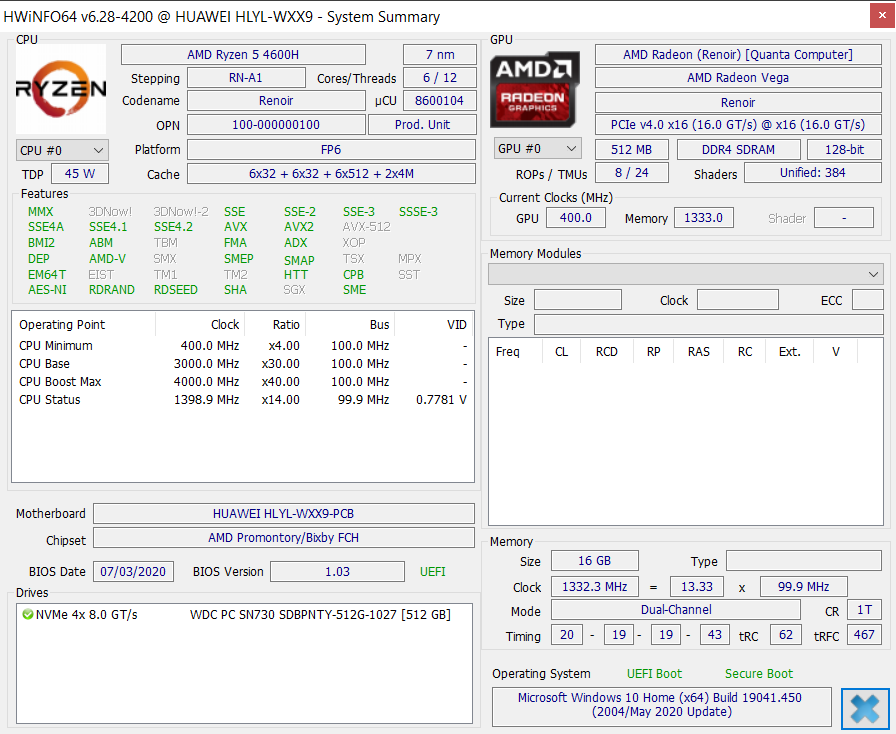 | Honor MagicBook Pro (AMD) Vega 6, R5 4600H, WDC PC SN730 SDBPNTY-512G | Dell XPS 15 9500 Core i5 UHD Graphics 630, i5-10300H, Toshiba KBG40ZNS256G NVMe | HP ProBook 455 G7-175W8EA Vega 7, R7 4700U, Samsung PM991 MZVLQ512HALU | Xiaomi RedmiBook 16 R5 Vega 6, R5 4500U, Samsung PM881 MZNLH512HALU-0000/07 | Honor MagicBook 15 Vega 8, R5 3500U, Samsung SSD PM981a MZVLB256HBHQ | |