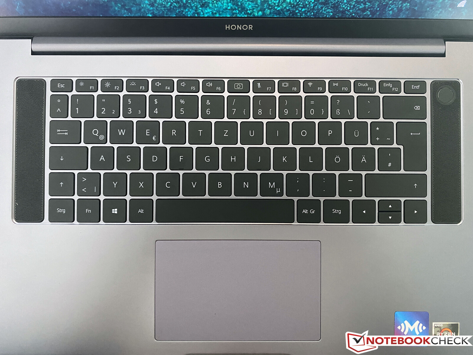 La experiencia de teclear es buena en promedio. El ruido de los trazos es bastante silencioso, pero la retroalimentación es un poco blanda con algunas teclas (por ejemplo, la barra espaciadora, las teclas de flecha). No hay duda de que hay mejores teclados para los portátiles, pero también puedes escribir textos más largos sin problemas en el MagicBook Pro. Una gran ventaja, sobre todo en las horas nocturnas, es la retroiluminación blanca de dos etapas del teclado. El botón de encendido, que se encuentra en la tira de altavoces derecha, también es un escáner de huellas dactilares.