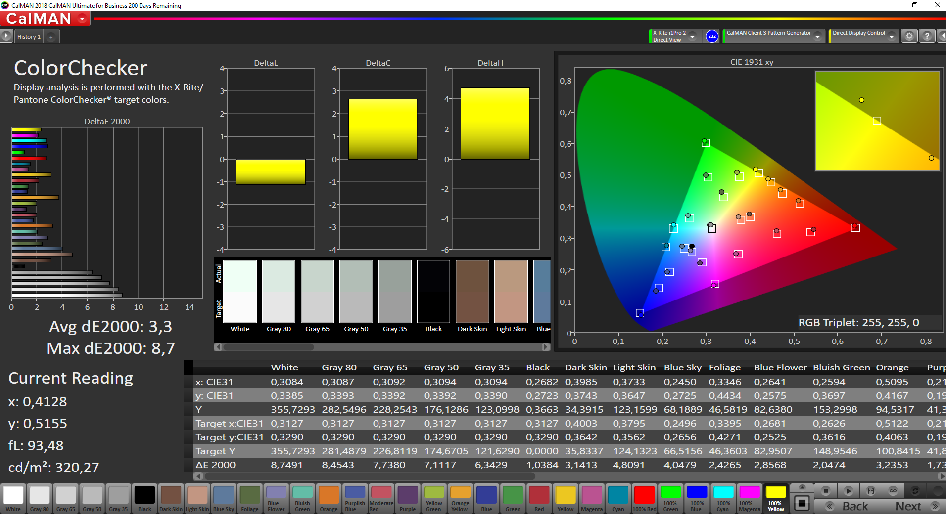 El análisis de CalMAN revela que los rojos y los azules están un poco subrepresentados, mientras que los grises son ligeramente exagerados. Estos problemas se pueden resolver completamente mediante la calibración. Puede descargar nuestro perfil ICC en la parte inferior de la caja que contiene todas las medidas de la pantalla (esta caja se encuentra a la izquierda del gráfico que muestra la distribución del brillo).
