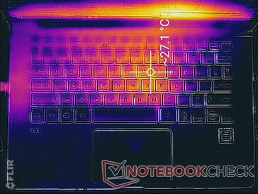 Las temperaturas de la superficie son planas cuando está en ralentí con el punto más caliente hacia el centro del teclado más cercano al procesador. Cuando está bajo carga máxima, este punto caliente puede llegar a ser tan caliente como 45 C, lo que es aproximadamente el promedio para un Ultrabook. Algunos sistemas de la competencia, como el XPS 13 o el ThinkPad X1 Carbon, pueden alcanzar hasta 50ºC, mientras que el Yoga C930, más grueso, apenas rompe la marca de los 40ºC. Los apoyos para la palma de la mano y el trackpad nunca se calientan de forma incómoda, independientemente de la carga en pantalla.