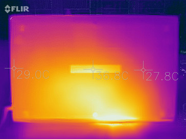El 15Z980 también funciona con relativa frialdad. Nuestro dispositivo de prueba tiene un promedio de 26,5 °C (79,7 °F) en reposo con una temperatura del aire ambiente de 21 °C (69,8 °F). Las temperaturas suben a un promedio de 33.1 °C (91.6 °F) bajo carga, con un promedio de 27 °C (80.6 °F) en el reposamanos. Tres áreas alcanzan temperaturas superiores a 40 °C (104 °F), pero no son temperaturas peligrosas.