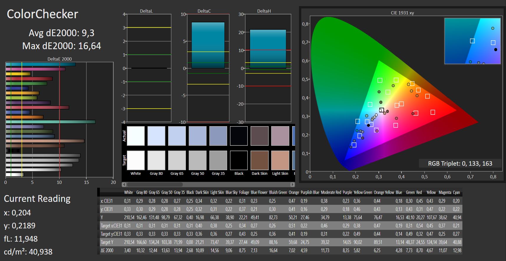 ΔE ColorChecker Calman: 9.3 | ∀{0.5-29.43 Ø4.78}
