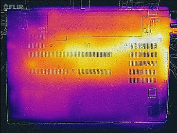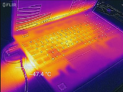 Bajo carga, el chasis se calienta directamente sobre la CPU, la GPU y el sistema de refrigeración. En particular, el centro y la parte superior izquierda del teclado se calientan cuando la CPU y la GPU se colocan a plena carga, y el panel inferior se vuelve incómodo. Como tal, el trabajo pesado debe hacerse en un escritorio. Tenga en cuenta que todo el calor se agota por la mitad del lado izquierdo; mantenga esta área despejada para una ventilación adecuada.
