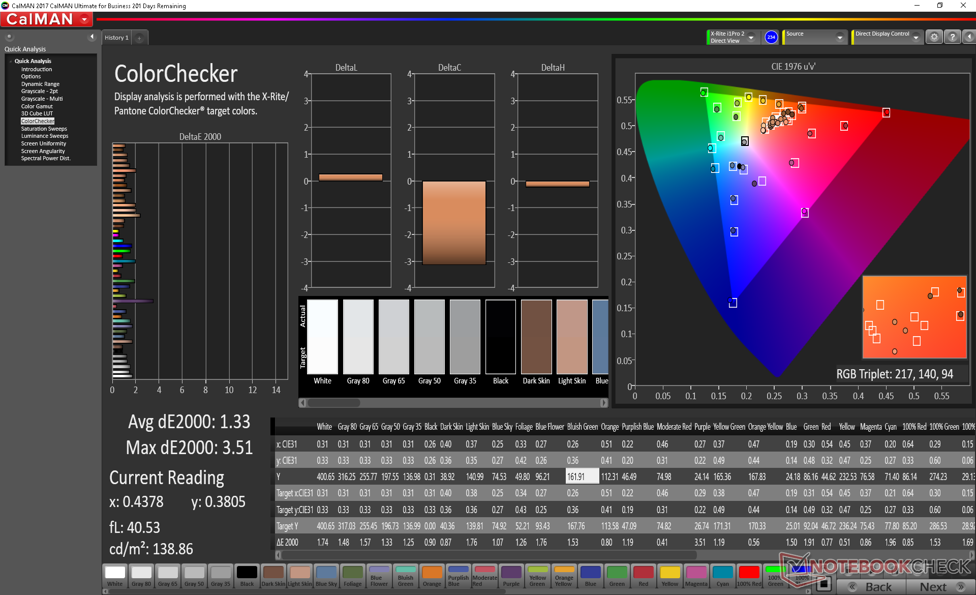 El mismo panel Chi Mei N173HCE-G33 AHVA sirve tanto para el GE75 9SG como para el GE75 8SG. Por lo tanto, todos nuestros comentarios sobre la pantalla GE75 8SG se aplican aquí. La pantalla es más brillante que la mayoría de los portátiles para juegos de 17 pulgadas con una excelente relación de contraste, tiempos de respuesta muy rápidos en blanco y negro y gris-gris para reducir el efecto fantasma, velocidad de actualización nativa de 144 Hz para obtener animaciones suaves y colores sorprendentemente precisos fuera de la caja. Este es un panel de muy alta calidad con casi ningún problema de granulosidad, a diferencia de lo que observamos en el Dell Inspiron 17 3780 de 17 pulgadas de presupuesto.