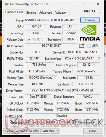 | MSI GF75 8RD-001 i7-8750H, GeForce GTX 1050 Ti Max-Q, Kingston RBUSNS8154P3256GJ1, IPS, 1920x1080, 17.3" | Asus TUF FX705GE-EW096T i7-8750H, GeForce GTX 1050 Ti Mobile, SK hynix BC501 HFM128GDJTNG-831, IPS, 1920x1080, 17.3" | Lenovo Legion Y730-17ICH, i7-8750H i7-8750H, GeForce GTX 1050 Ti Mobile, Toshiba KBG30ZMT128G, IPS, 1920x1080, 17.3" | Medion Erazer P6705-MD61131 i7-8750H, GeForce GTX 1050 Ti Mobile, Samsung SSD PM981 MZVLB256HAHQ, TN, 1920x1080, 15.6" | HP Pavilion Gaming 15-cx0003ng i7-8750H, GeForce GTX 1050 Ti Mobile, Intel Optane 16 GB MEMPEK1J016GAH + HGST HTS721010A9E630 1 TB HDD, IPS, 1920x1080, 15.6" | Acer Aspire 7 A715-72G-704Q i7-8750H, GeForce GTX 1050 Ti Mobile, Intel SSD 760p SSDPEKKW256G8, IPS, 1920x1080, 15.6" | Medio NVIDIA GeForce GTX 1050 Ti Max-Q | Media de la clase Gaming | |