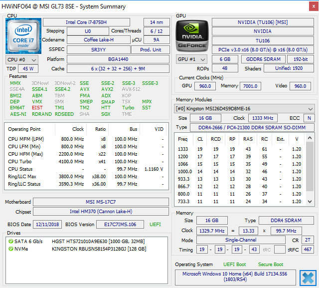 | MSI GL73 8SE-010US i7-8750H, GeForce RTX 2060 Mobile, Kingston RBUSNS8154P3128GJ, TN LED, 1920x1080, 17.3" | MSI GE73 8RF-008 Raider RGB i7-8750H, GeForce GTX 1070 Mobile, Toshiba HG6 THNSNJ256G8NY, TN WLED, 1920x1080, 17.3" | MSI GL73 8RD-418US i7-8750H, GeForce GTX 1050 Ti Mobile, Kingston RBUSNS8154P3128GJ, TN LED, 1920x1080, 17.3" | MSI GL72 7RDX-602 i7-7700HQ, GeForce GTX 1050 Mobile, HGST Travelstar 7K1000 HTS721010A9E630, TN LED, 1920x1080, 17.3" | MSI GS73 Stealth 8RF-011 i7-8750H, GeForce GTX 1070 Max-Q, Samsung PM961 MZVLW256HEHP, TN, 1920x1080, 17.3" | MSI GF62VR 7RF-877 i7-7700HQ, GeForce GTX 1060 Mobile, Intel SSD 600p SSDPEKKW256G7, TN LED, 1920x1080, 15.6" | |