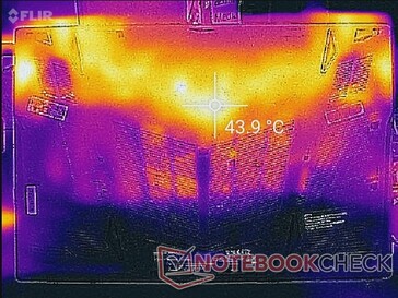 El mayor beneficio de tener un chasis tan grande es la temperatura relativamente fría de la superficie cuando se está bajo carga. Los apoyos para la palma de la mano y las teclas WASD permanecen significativamente más frías en comparación con los sistemas más delgados como el MSI GS65 o el Asus TUF FX705GM. En el peor de los casos, las temperaturas de la superficie pueden ser de hasta 46ºC cerca de la esquina trasera del portátil, donde es poco probable que los usuarios se toquen, en comparación con los más de 51ºC del GL72 antiguo. Sólo recuerde no bloquear ninguna de las muchas rejillas de ventilación.