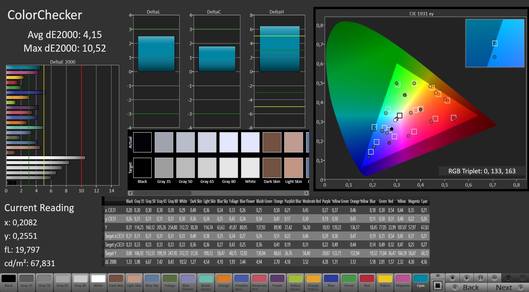| Colorchecker dE 2000 max. * | 10.52 | 9.13 13% | 20.5 -95% | 18.89 -80% |