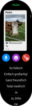 El manejo de los mensajes, en la prueba de WhatsApp, es casi ejemplar. Desde la foto de perfil del remitente, pasando por la visualización de fotos y emojis, hasta la presentación clara de varios mensajes en el chat del grupo, ya facilita la captura rápida de los mensajes entrantes. Las respuestas se realizan mediante dictado de voz, teclado normal o T9 o mediante la introducción de letras escritas a mano. Sin embargo, no hay ninguna aplicación de WhatsApp en Galaxy Store, por lo que sólo se puede responder y no iniciar nuevos mensajes.