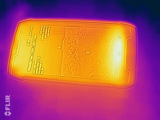 La carcasa se calienta hasta un máximo de 36,9 °C bajo una carga fuerte. Esto se nota pero no es un problema. Este punto caliente se limita al área superior de la parte posterior del teléfono. Las temperaturas máximas son unos grados más bajas mientras está en reposo.