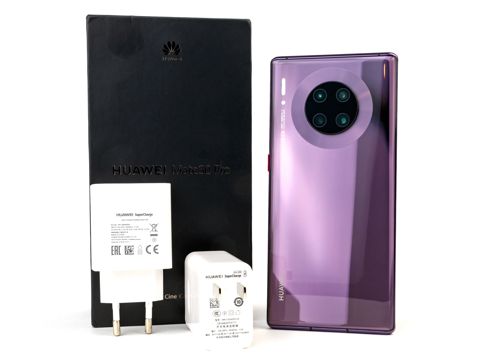 El Huawei Mate 30 Pro viene con una fuente de alimentación modular de 40 W, un cable USB (de tipo A a tipo C), un juego de auriculares, algo de documentación, una herramienta SIM y una cubierta de silicona transparente. Sin embargo, esta última sólo se incluye en la versión china.