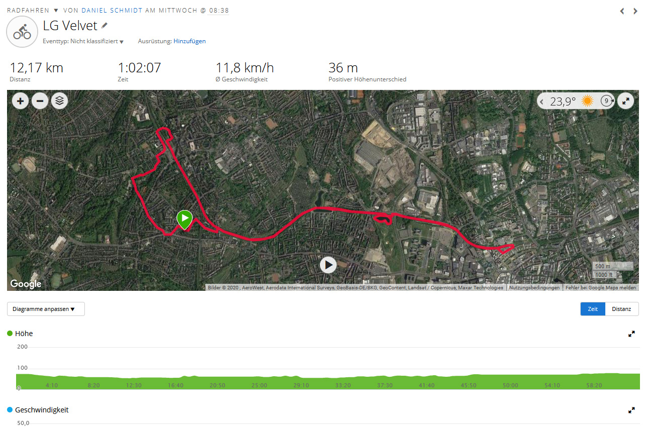 Para determinar cuán preciso es nuestro dispositivo de revisión en cuanto a la geolocalización, lo llevamos con nosotros en un paseo en bicicleta. Durante este paseo, también nos acompaña el navegador profesional Garmin Edge 500. Al final de nuestro paseo de 12 km, sólo hay una diferencia de 20 metros entre el módulo GPS del smartphone y el navegador. El smartphone hizo un gran trabajo mapeando nuestra ruta, por lo que podemos decir que es apto para su uso como dispositivo de navegación.