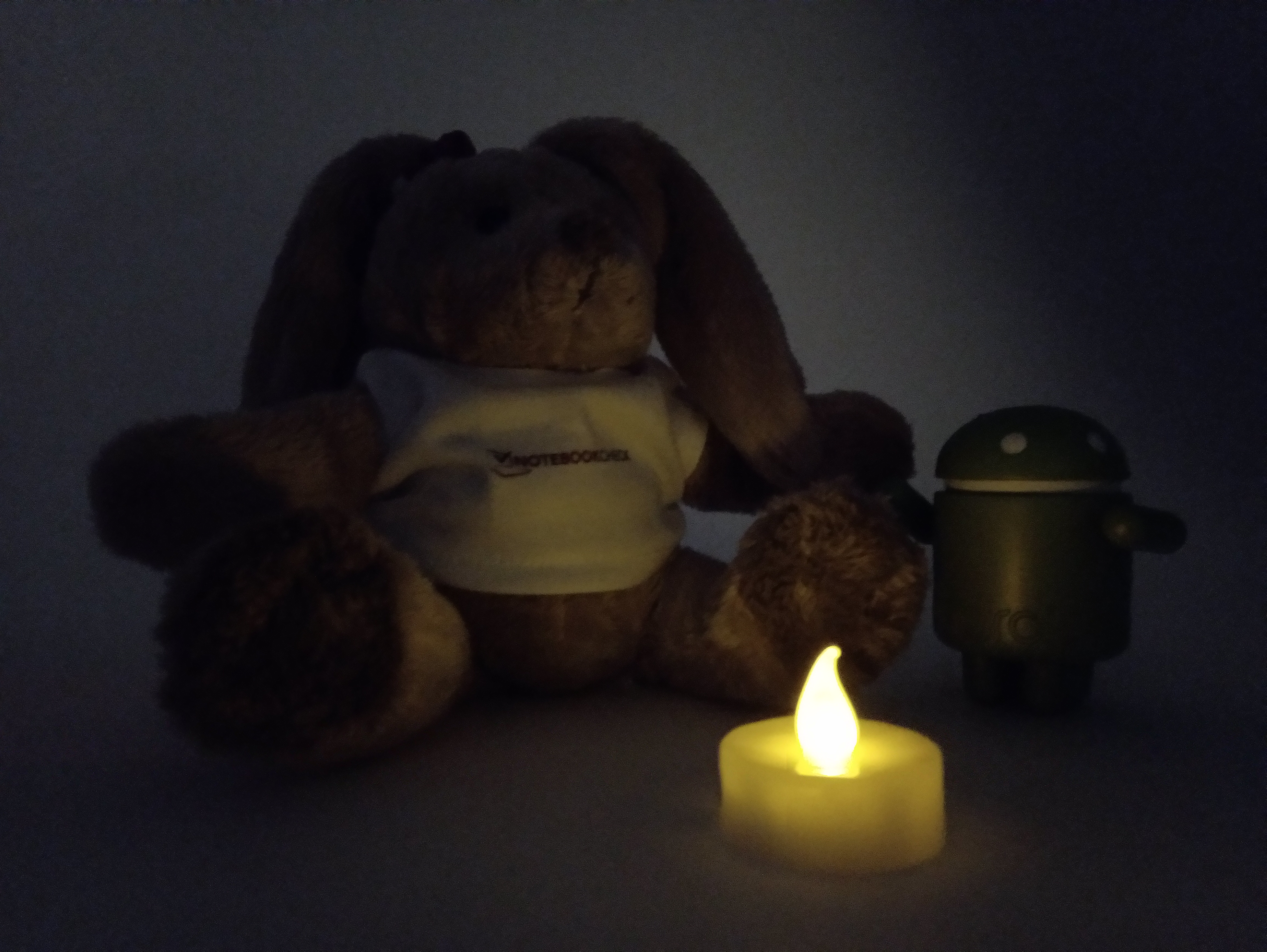 La diferencia de calidad entre los candidatos se hace muy evidente en la oscuridad. Aquí, la representación del paisaje por parte de Nokia parece mucho más oscura que la de los otros dos smartphones". La etiqueta "Notebookcheck" en el conejo de peluche es apenas reconocible. El P20 se distingue de su competencia en este aspecto, ya que muestra la etiqueta con la suficiente claridad como para que pueda ser leída sin dificultad.