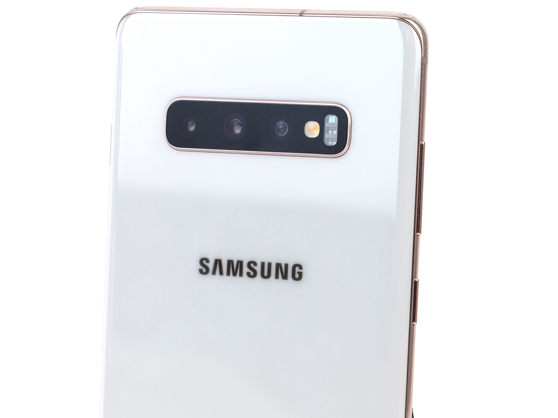 Nuestra unidad de revisión Ceramic White tiene un marco de acero inoxidable con un sutil acabado en oro rosa que, en nuestra opinión, se ve muy bien en persona. La carcasa de la cámara orientada hacia atrás sobresale ligeramente de la cerámica posterior, por lo que el S10+ no quedará plano, pero hay un marco metálico alrededor de la carcasa que debería proteger el cristal de arañazos cuando el dispositivo se coloca sobre una superficie plana.