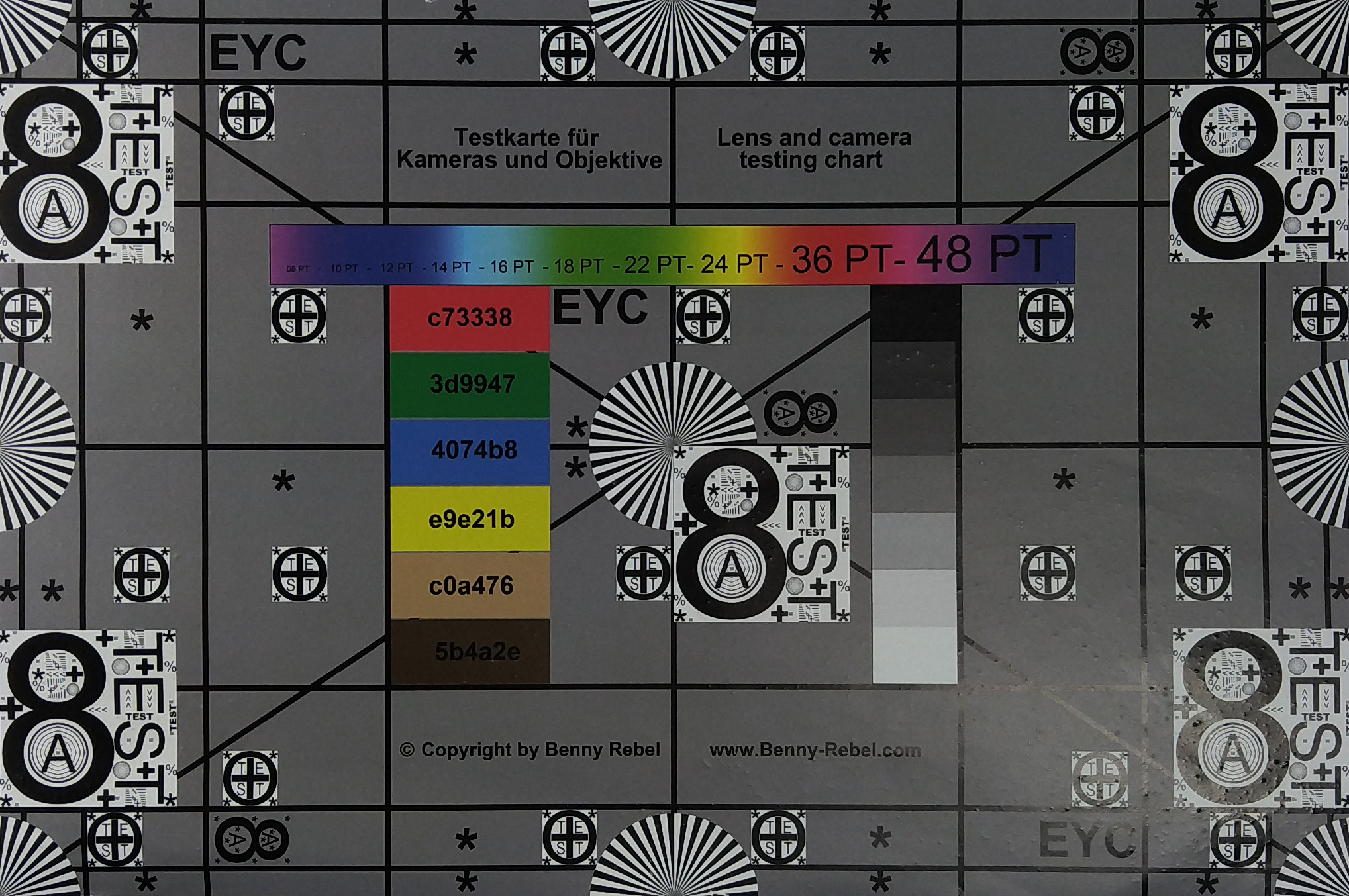 Bajo condiciones de luz controlada en el laboratorio, notamos la reproducción muy oscura de la imagen de prueba, que también vimos en las fotos realistas que tomamos. En texto negro delante de fondo marrón, ya no se puede reconocer la escritura. Los colores también están distorsionados y se reproducen demasiado oscuros. Por otro lado, la nitidez de la imagen es muy buena también aquí, y no disminuye ni siquiera en las zonas de los bordes.