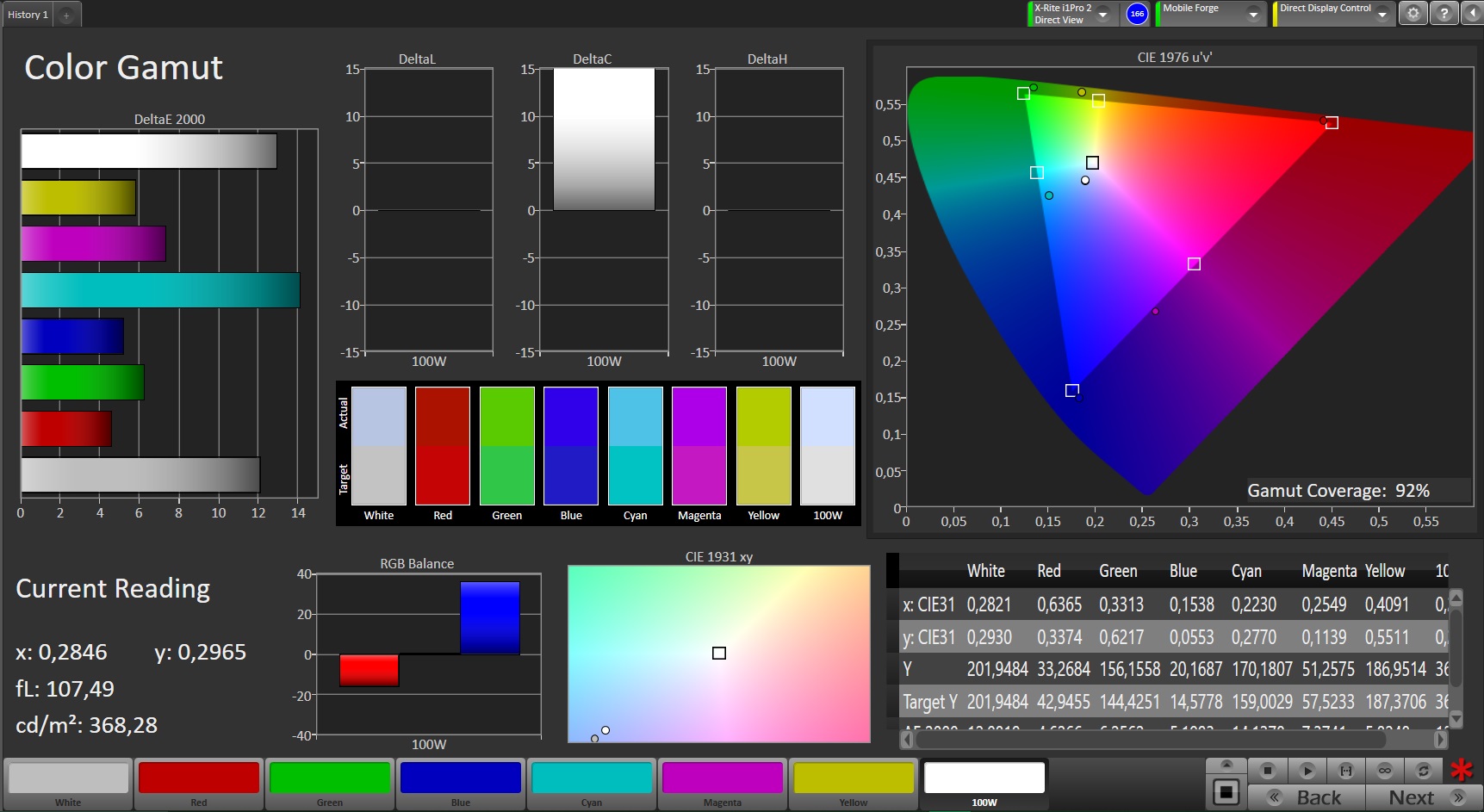 Además, el software de análisis CalMAN destaca que la pantalla de nuestro dispositivo de prueba tiene un fuerte tinte azul.