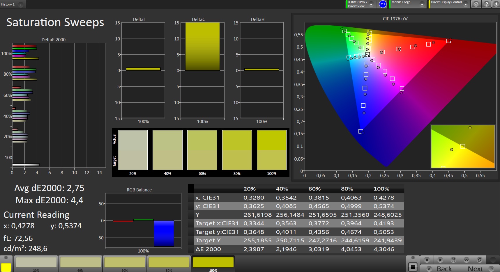 Sin embargo, el análisis de CalMAN también muestra un tinte azul ligeramente elevado. Esto se puede remediar con un ajuste de la temperatura de color en el menú Configuración. Para ello, puede utilizar algunos modos preestablecidos o una escala de color para los ajustes manuales.