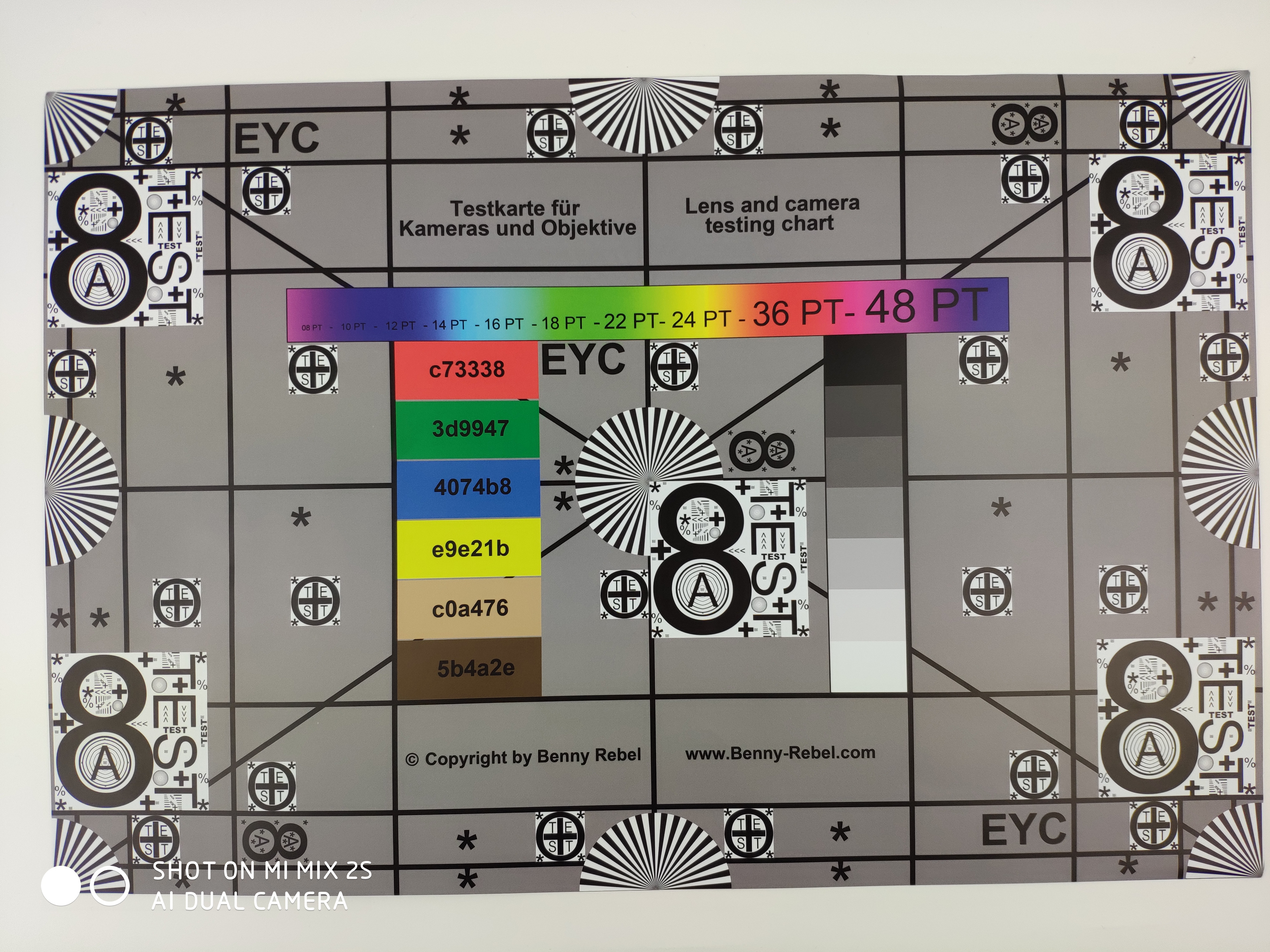 Bajo condiciones de luz controlada en nuestro laboratorio de pruebas, la imagen de la carta de ajustes muestra una ligera borrosidad. En general, las condiciones de luz aquí son comparables con las grabaciones tomadas con luz ambiental débil: mientras que la imagen sigue siendo buena en general, podemos ver algunas pequeñas imperfecciones en la vista detallada. El Mi Mix 2S registra los colores en la tabla de prueba de ColorChecker ligeramente demasiado brillantes en general.