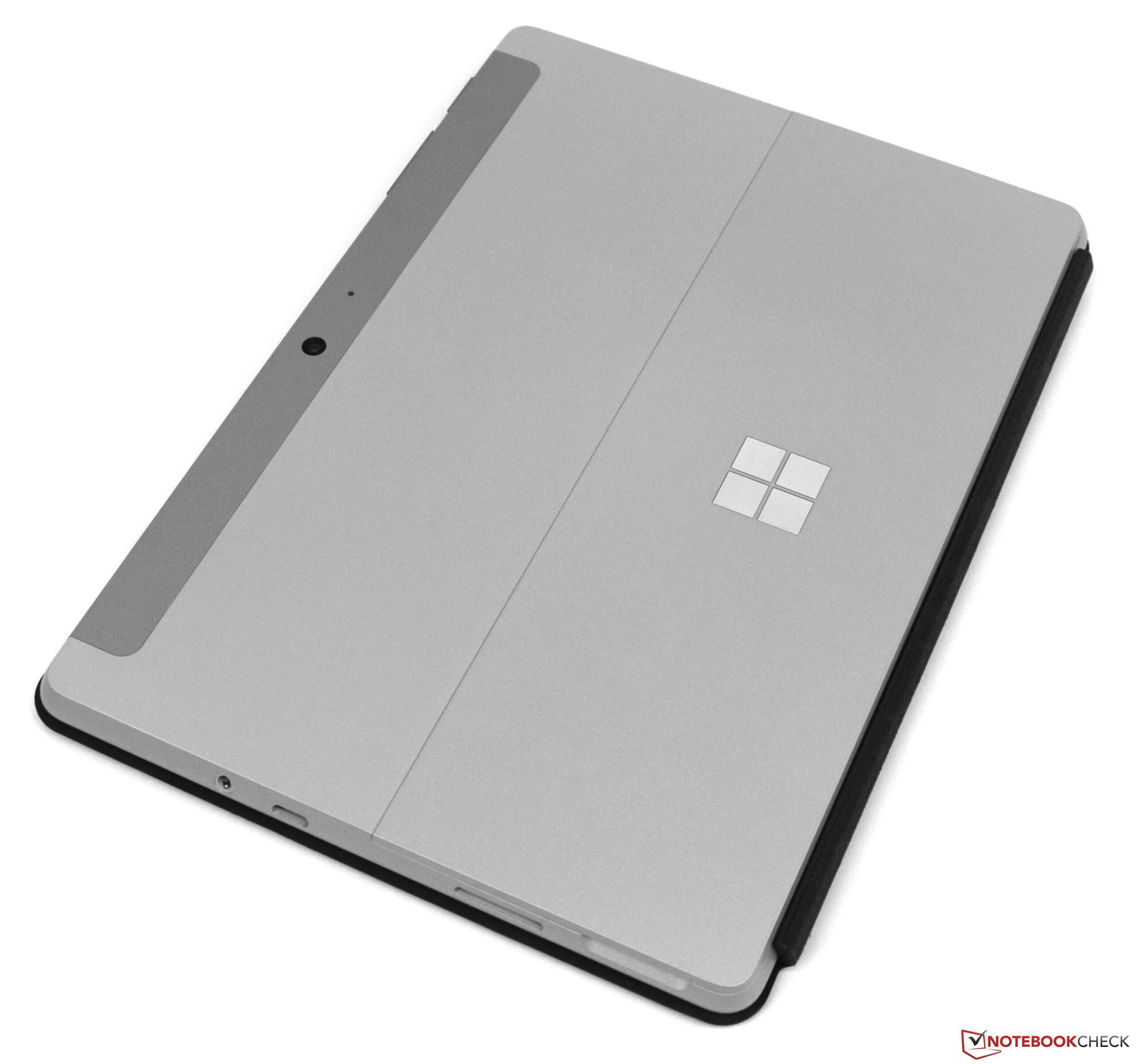 Cuando se trata del caso, Microsoft ha tomado el enfoque bien probado y ha equipado el dispositivo de nivel de entrada con el conocido caso de magnesio con Corning Gorilla Glass 3 en la parte delantera. Al igual que todas las demás tabletas de superficie, el Go cuenta con el soporte desplegable en la parte posterior. Su bisagra era sorprendentemente firme, y se abrió hasta 170 grados. Los biseles negros de la pantalla del Go eran muy dominantes en comparación con otros dispositivos modernos.