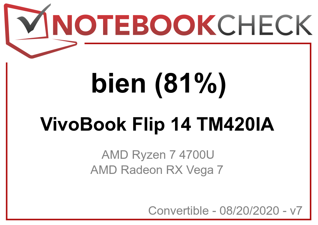| 80.7 % v7 (old) | 08/2020 | Asus VivoBook Flip 14 TM420IA R7 4700U, Vega 7 | 1.6 kg | 18.2 mm | 14.00" | 1920x1080 | |