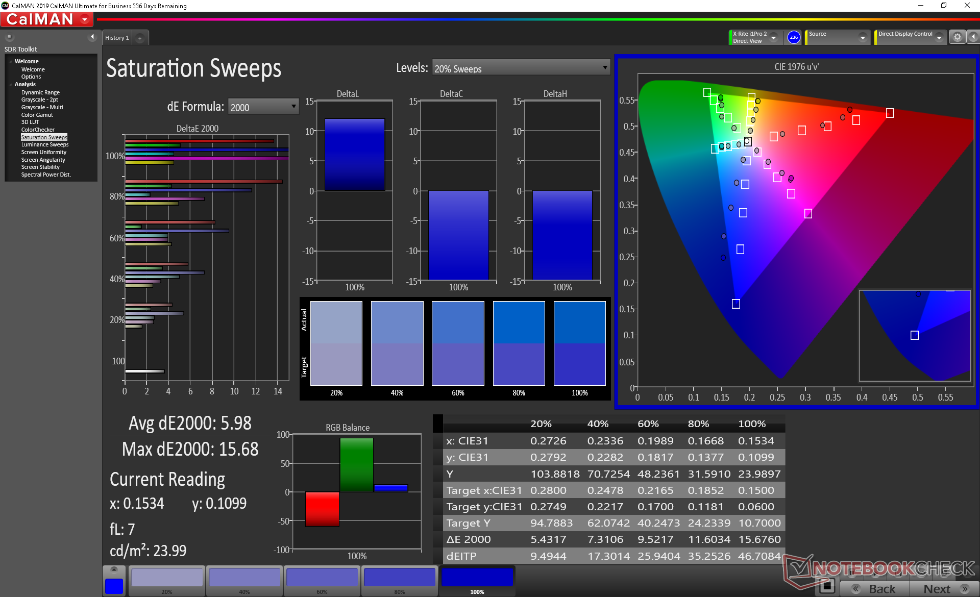 La pantalla está mal calibrada de fábrica, con un horrible balance RGB y un alto valor promedio de DeltaE en escala de grises de 9.5. La calibración del panel nosotros mismos mejora la escala de grises y el balance de color dramáticamente, pero los niveles de saturación más altos todavía se reproducen pobremente debido a la estrecha gama antes mencionada.