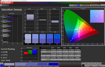 También hay que hacer recortes en los espacios de color de trabajo. Mientras que el Adobe RGB sólo está cubierto en un 40%, el espacio de color sRGB, mucho más pequeño, sólo puede ser mostrado en un 63%. En el estado de fábrica, la visualización es un poco demasiado fría, como muestra el análisis con CalMAN. Sin embargo, una calibración asegura una mejor visualización; especialmente la escala de grises es entonces mapeada casi idealmente. La imagen en color también es nítida, pero muestra algunos valores atípicos, lo que se debe al reducido espacio de color.