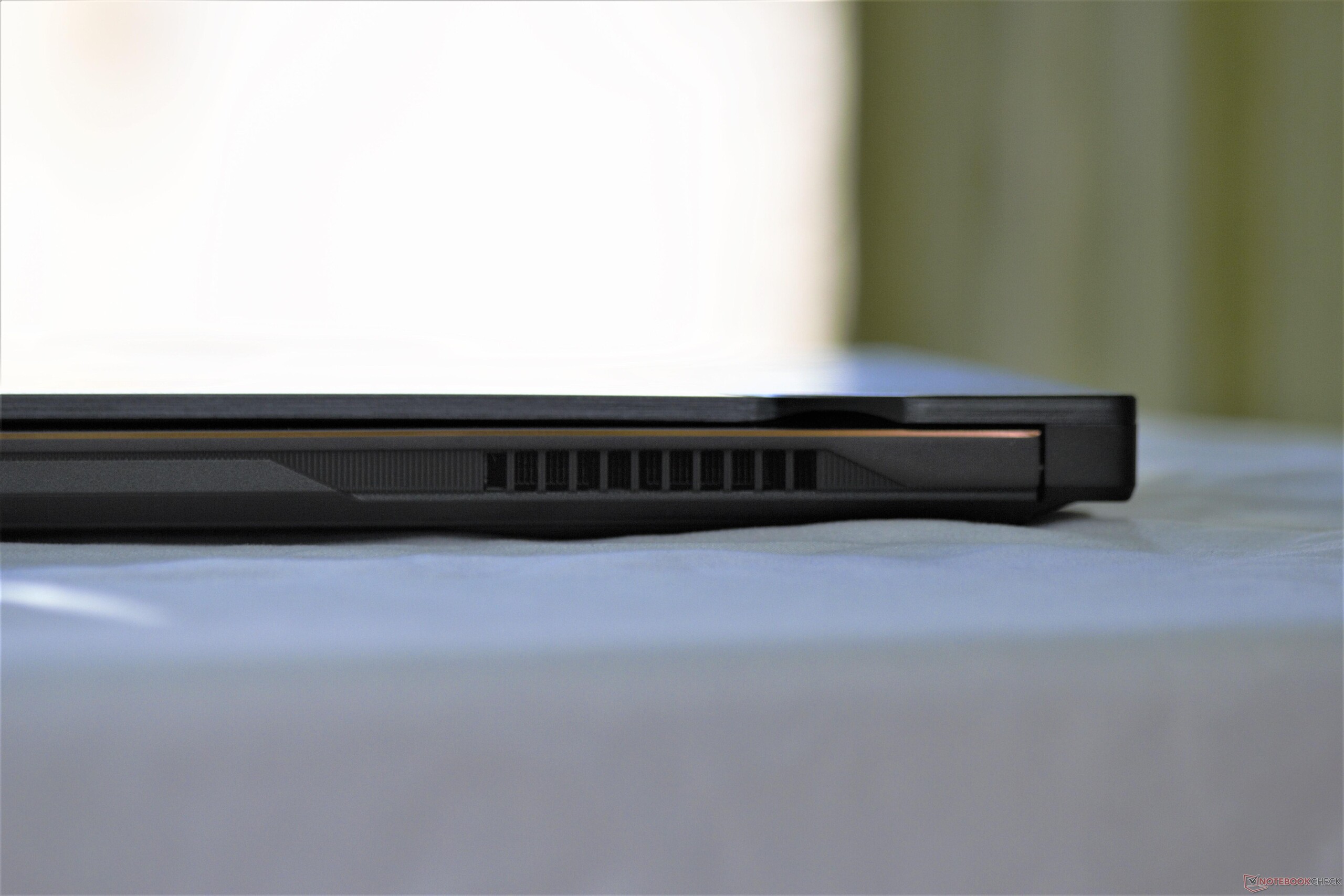 Por lo demás, la carcasa es el misma que la del Zephyrus M GM501. A pesar de su perfil delgado, el chasis es robusto y resistente a la deformación. El panel inferior de plástico también se mantiene firme cuando se presiona. La tapa se puede deformar (ligeramente hundida) con presión directa en el centro. La tapa también se puede dejar cóncava sin mucho trabajo, pero ninguna deformación es permanente. El mecanismo de bisagra está bien ajustado, permitiendo la apertura con una sola mano y manteniendo la malla estable mientras se escribe. Los puntos más dolorosos del diseño son los biseles de plástico alrededor de la pantalla. Tanto la Aero 15X como la MSI GS65 tienen biseles mucho más pequeños que mantienen la pantalla en su sitio y, como resultado, ocupan menos espacio. Los biseles de plástico de la GU501GM parecen casi cómicamente grandes en contraste.