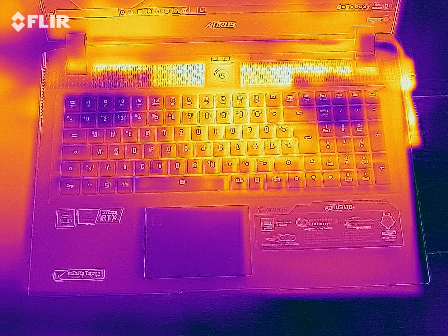 Las cosas se ven diferentes cuando se trata de las temperaturas de la superficie. Mientras que el área de descanso de la muñeca nunca se calienta, las temperaturas en la parte inferior pueden alcanzar hasta 59 °C. Por eso no recomendamos poner el Aorus 17G en el regazo cuando se juega.