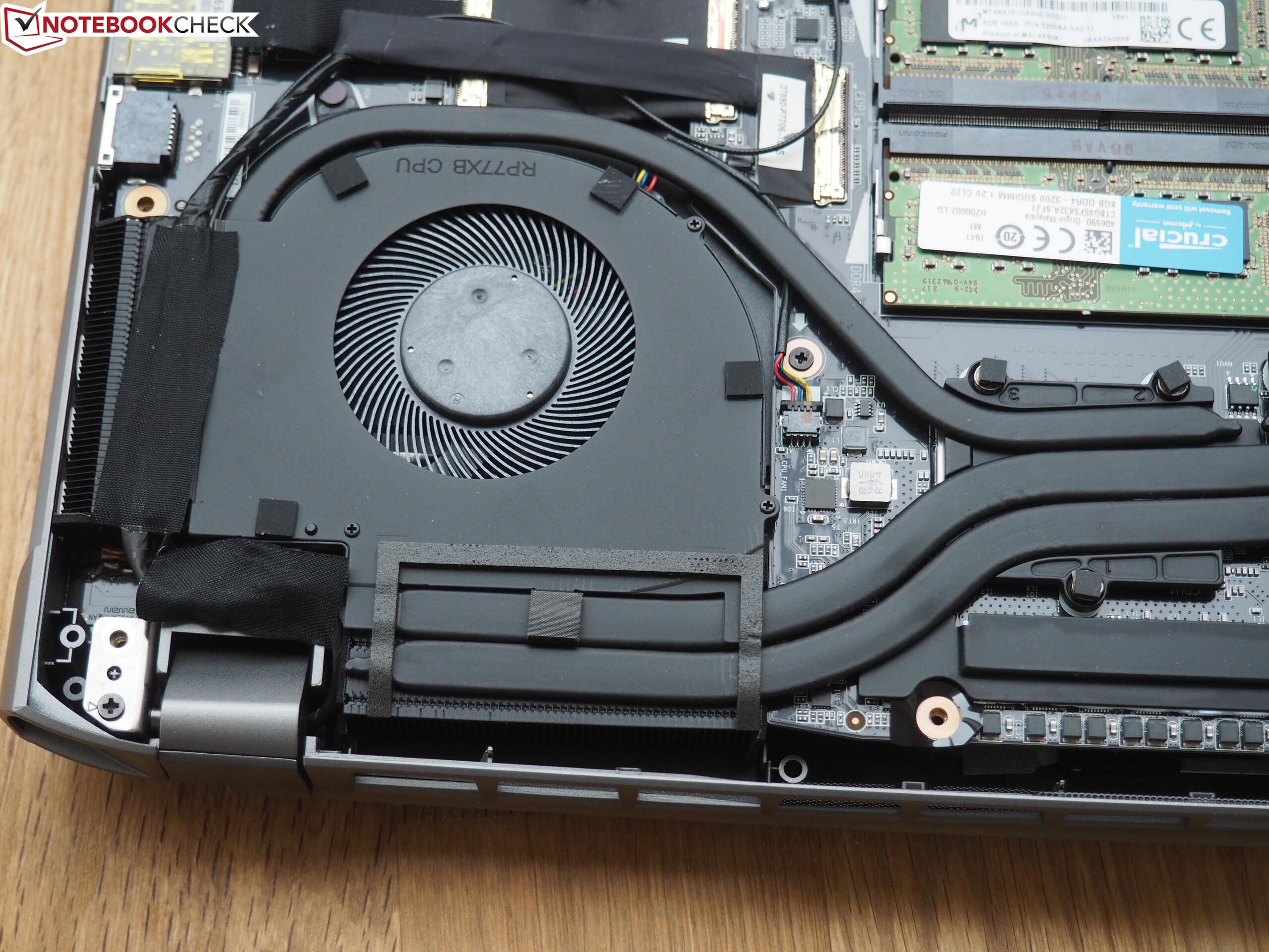Las opciones de mantenimiento son típicas de un dispositivo de tan alta potencia. Una vez que deshaga los 14 tornillos Torx de la parte inferior, podrá retirar la cubierta inferior haciendo palanca (recomendamos empezar por el puerto Ethernet RJ45). Dentro del chasis tendrá acceso al módulo Wi-Fi, a la batería, a dos ranuras DDR4 RAM y a dos ranuras M.2-2280. El sistema de refrigeración consiste en dos ventiladores, a cada uno de los cuales están conectados tres tubos de calor. Como de costumbre, tanto la CPU como la GPU están soldadas y por lo tanto no pueden ser reemplazadas.