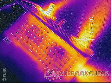 Es importante que los portátiles para juegos tengan superficies frías en las que las palmas y los dedos se apoyen. En este caso, las palmas de las manos y las teclas WASD nunca están incómodamente calientes sin importar la carga de la pantalla. El centro del teclado puede llegar a calentarse hasta 37 C cuando se juega, mientras que los puntos calientes reales a lo largo de los bordes exteriores del teclado pueden llegar a calentarse hasta 47 C. Afortunadamente, los puntos calientes se concentran en puntos muy específicos, a diferencia de las series más delgadas Razer Blade o MSI GS, en la que los gradientes de temperatura tienden a ser menos profundos.