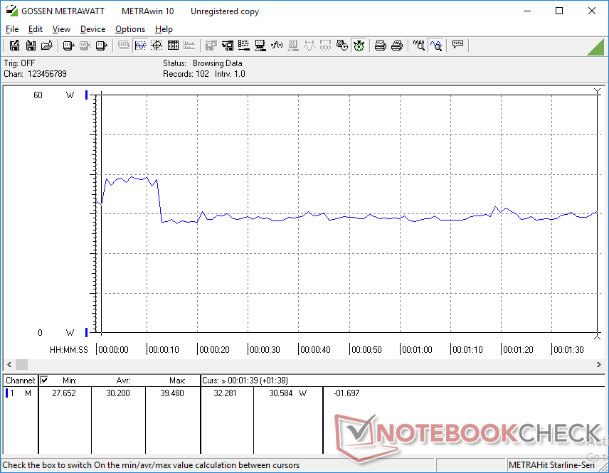 Somos capaces de registrar un consumo máximo de 44,4 W desde el pequeño (~5,3 x 5,3 x 2,8 cm) adaptador de CA de 45 W. Este consumo máximo se reduce con el tiempo debido a la aceleración del rendimiento, como se muestra en los siguientes gráficos.