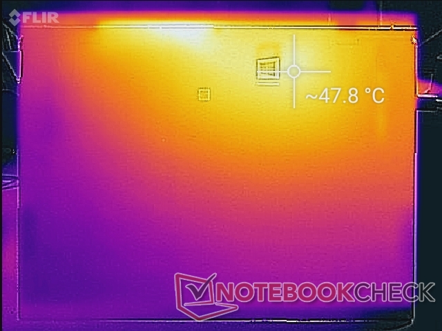 Las temperaturas de la superficie siempre serán más cálidas en la mitad izquierda del portátil que en la derecha debido a la forma en que la solución de refrigeración y la CPU están colocadas en el interior. Cuando se está bajo un alto estrés de procesamiento como en los juegos, los puntos calientes pueden llegar a ser tan calientes como 43 C o 48 C en el teclado o en las superficies inferiores, respectivamente, para ser similares a los del XPS 13 9300. Espere que las teclas se calienten después de largas sesiones de navegación o de uso intenso.