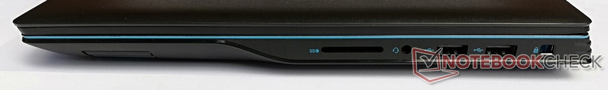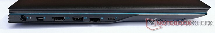 El Dell G3 15 ofrece una buena elección de puertos. Se nota especialmente que se pueden conectar numerosos monitores al portátil para juegos. No sólo hay un HDMI y un mini puerto de pantalla disponible para este propósito, sino que también se pueden conectar dispositivos de visualización a través del conector Thunderbolt 3.