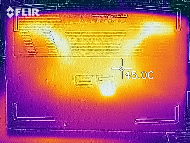 Nuestras mediciones muestran que el Dell G3 15 tiene temperaturas superficiales de hasta 58,6 °C (137,48 °F) bajo carga. Por lo tanto, el portátil de juegos se calienta con bastante fuerza, con los puntos más calientes en la parte inferior de la unidad base. Sin embargo, los reposamuñecas siempre se mantienen moderadamente calientes, lo que no limita el uso del portátil. Sin embargo, no se recomienda la colocación en los muslos para los juegos prolongados.