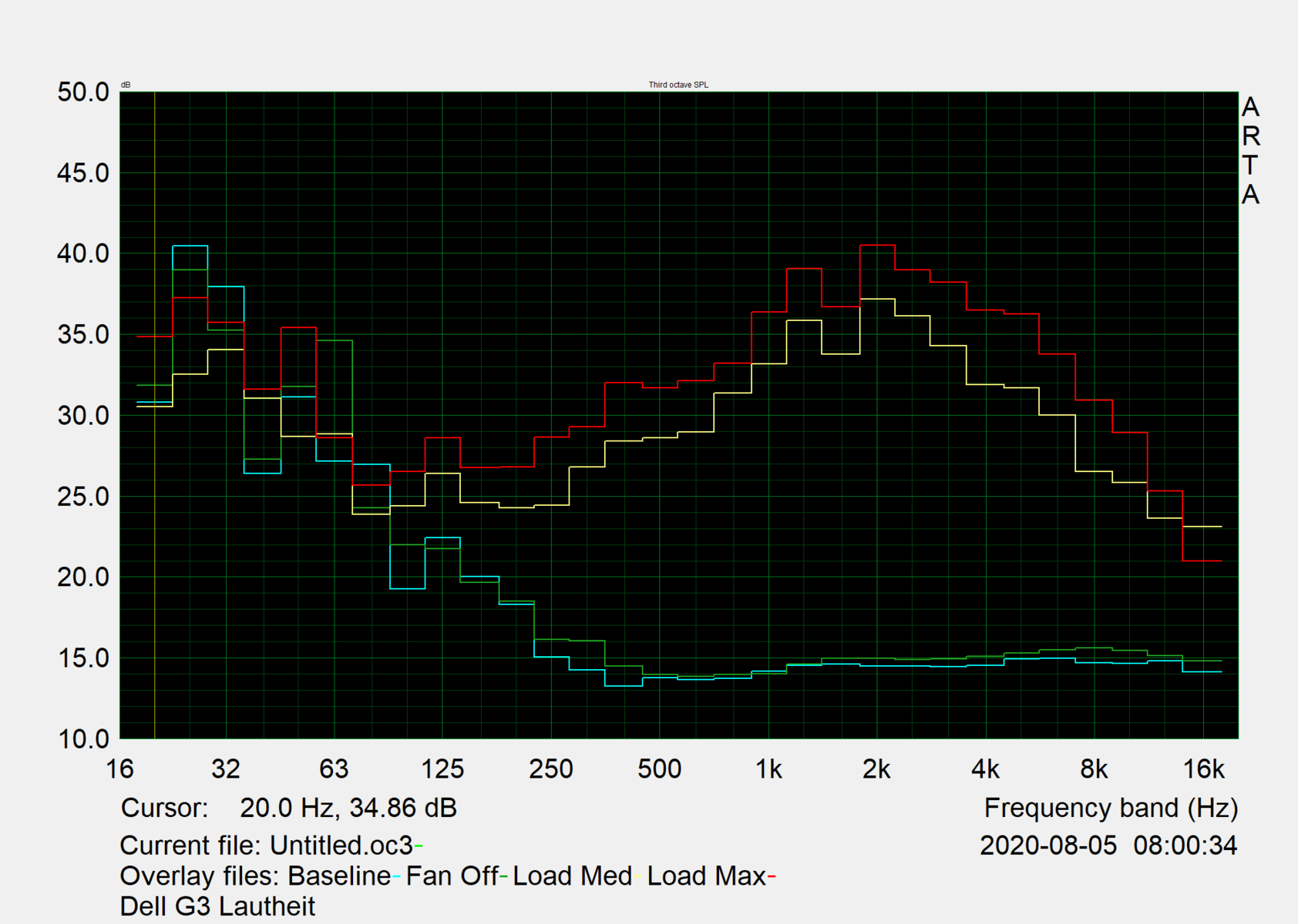 Los ventiladores del Dell G3 15 pueden llegar a ser muy ruidosos con hasta 48,7 dB(A) bajo carga. El ruido resultante es parejo, pero no se puede desvanecer fácilmente con el ruido ambiental. Por lo tanto, los usuarios deben considerar el uso de auriculares externos para contrarrestar el nivel de ruido.