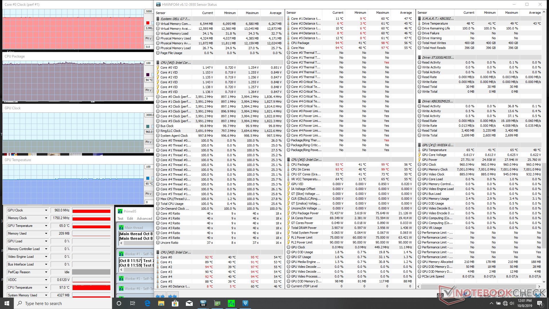 Hacemos hincapié en el portátil con cargas sintéticas con el fin de identificar cualquier problema potencial de estrangulamiento o estabilidad. Cuando se ejecuta Prime95 para acentuar la CPU, las frecuencias de reloj saltan a una frecuencia constante de 4 GHz y mantienen esta velocidad durante todo el proceso para reflejar las observaciones de la prueba de bucle de CineBench anteriores. El inconveniente, sin embargo, es una temperatura central muy alta de >94 C. En comparación, el Razer Blade 15 Base Model con la misma CPU i7-9750H aumentaría a 4 GHz durante sólo unos segundos antes de caer a una temperatura central estable de 2,8 GHz y a una temperatura central más fría de 70 C.