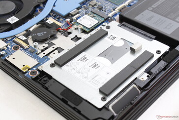 El panel inferior se desprende más fácilmente que en el G3 3590, ya que sólo se necesita un destornillador Philips sin necesidad de un borde afilado. Los usuarios tienen acceso directo a ambas baterías, a las dos bahías SATA III M.2 + 2,5 pulgadas, a las ranuras SODIMM y al módulo WLAN. En comparación con el antiguo G7 7588, el G7 7590 carece de la armadura metálica interna necesaria para un diseño de placa base "abierto" más estándar.