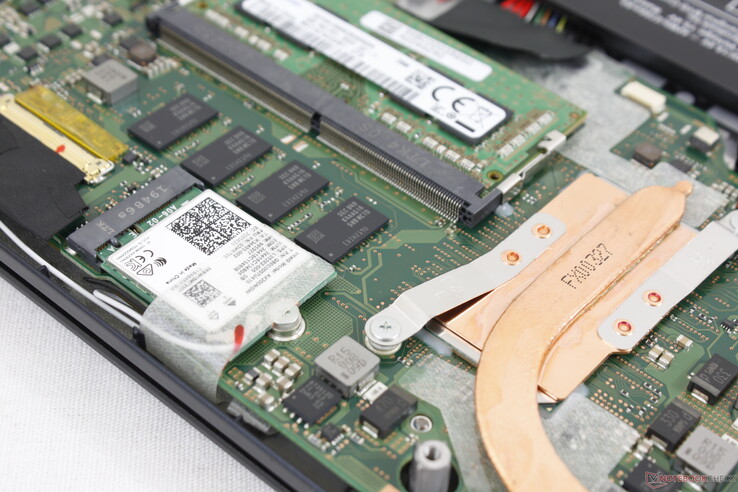 El panel inferior está asegurado por 12 tornillos Philips para facilitar el acceso. Una vez dentro, los usuarios tienen acceso directo a una ranura SODIMM, al módulo WLAN M.2 y a la batería interna. La ranura primaria M.2 2280 está desafortunadamente debajo de la placa madre y es más difícil de acceder.