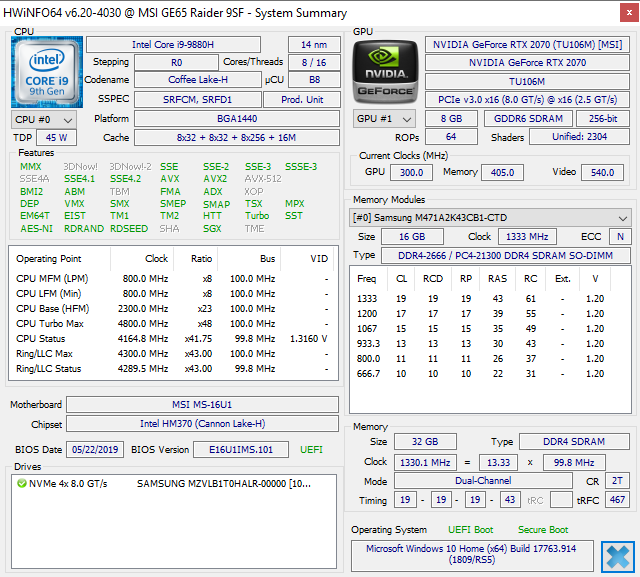 | MSI GE65 Raider 9SF-049US i9-9880H, GeForce RTX 2070 Mobile, Samsung SSD PM981 MZVLB1T0HALR, IPS, 1920x1080, 15.6" | Eurocom Nightsky RX15 i9-9980HK, GeForce RTX 2070 Mobile, Samsung SSD 970 Pro 512GB, OLED, 3840x2160, 15.6" | Maingear Vector 15 i7-9750H, GeForce GTX 1660 Ti Mobile, , IPS, 1920x1080, 15.6" | Razer Blade 15 RTX 2080 Max-Q i7-9750H, GeForce RTX 2080 Max-Q, Samsung SSD PM981 MZVLB512HAJQ, IPS, 1920x1080, 15.6" | MSI P65 Creator 9SF-657 i9-9880H, GeForce RTX 2070 Max-Q, 2x Samsung SSD PM981 MZVLB512HAJQ (RAID 0), IPS, 3840x2160, 15.6" | MSI GE63 Raider RGB 8RF-008 i7-8750H, GeForce GTX 1070 Mobile, Samsung SSD PM871a MZNLN256HMHQ, TN, 1920x1080, 15.6" | |