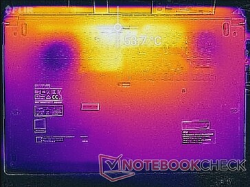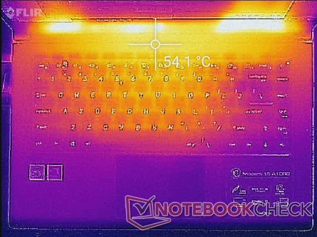 Las temperaturas de la superficie cuando está en reposo son generalmente planas con los puntos más calientes hacia la parte trasera central de la laptop más cercana a los procesadores. Cuando se juega o se ejecutan otras cargas intensivas, estos puntos calientes pueden llegar a ser tan calientes como 45 C en el centro del teclado hasta 57 C en las rejillas de ventilación inferiores. El Asus ZenBook 15 de la competencia con la más rápida GTX 1650 Max-Q funciona mucho más frío a unos 45 C a 47 C cuando se encuentra bajo cargas de procesamiento similares. Afortunadamente, los puntos calientes del MSI están alejados de los apoyos de la palma de la mano, del teclado y de las teclas WASD para ser discretos.